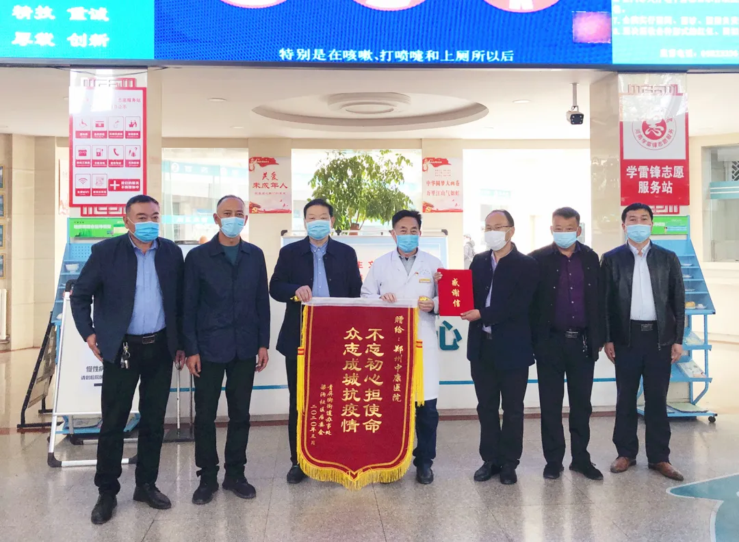 3月31日,新密市青屏办事处党政办副主任张飞、魏亚伟,青屏街梁沟社区党支部书记韩建召,主任王建遂等人将一面锦旗和感谢信送到了郑州中康医院。